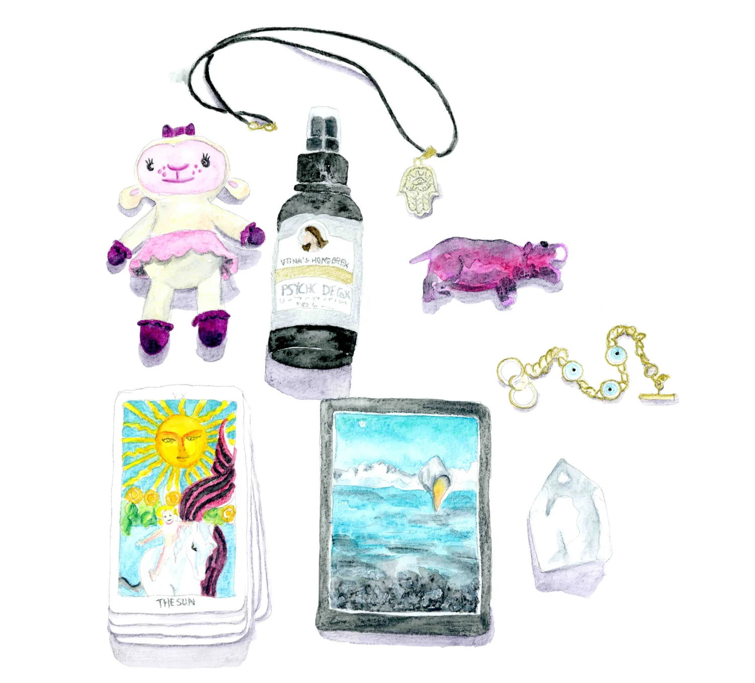 I open up my readings with a draw from The Power Deck, an oracle deck from Lynne Andrews. These cards have gorgeous pictures and profound statements on the back — taking a moment to read these meanings helps my clients settle in and ground before the reading commences. I have crystals scattered around my office. These lend a grounding energy to the room. I like to wear talismanic jewelry to protect my energy because my work can be extremely draining. Psychic Detox spray from Valentina’s Home Brewed is also a staple around here — I use that spray to clear energy, especially after a very emotional or hard reading.