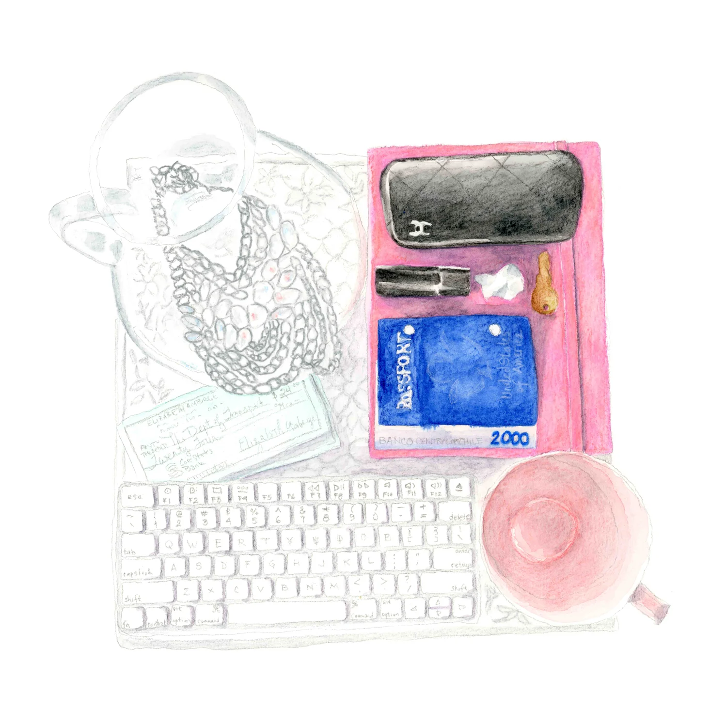 Truthfully, I think the glass decanter and the silver chains are about a 65% toward pulling off the feel of glass and metal, and I had fun trying to re-create the signature on the check (since I'm Elizabeth too, I struggled to not sign it in my own signature style) and the humour and edgy bit? I think Ash's own writing below will pull that together. But the keyboard. The little buttons, the symbols. The shadows on the board. Who knew I'd be so pleased about painting another keyboard, but I am. Now here's Ash: