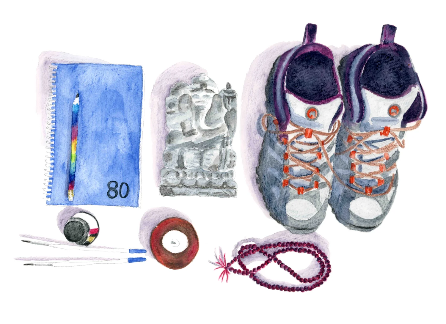 My day starts out — rain or shine or snow or sleet (ok, maybe not hail) — with a walk. My dog Lucy and I walk down by the river behind my house and so my waterproof, warm shoes are very important to me. I often wear mala beads around my neck or have them sitting on my desk to remind me to reconnect with my breath. I also have a statue of Ganesha on my desk to remove obstacles. I love all the symbolism around Ganesha: big head for thinking big, small eyes for concentration, large ears for listening, axe to cut off attachments, etc. Every time I see him I feel better. Then I have tools like my brushes and ink which are used daily for my work. I also use a plain notebook and pencil to organize my life. They hold my weekly to-do lists, grocery lists, random notes and thoughts, etc. I’m sane because of that 80-cent notebook. And lastly, a simple candle. Every night I go around the house closing the curtains and lighting a few candles. This ritual helps me know that the work day is done and it’s time to relax and let the day go.
