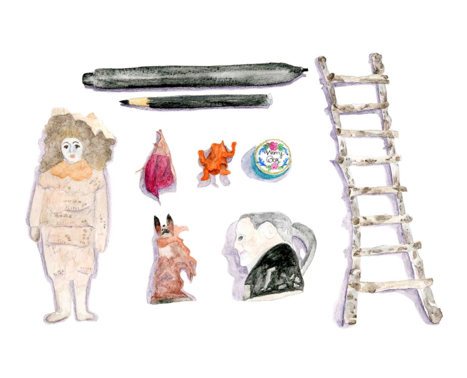 I collect many small objects and a few of these are ones I have had for many, many years. George Mortal Freak is my orange eraser in the form of a monster and I have had him since before the age of 10. The same goes for the red dressed wood fairy with a pearl head. I have my grandmother’s “worry box” and various other little talismans sitting around on my desk all the time. I have more than one desk, actually, and lots of spaces where I keep stuff sitting out because I like to see these things. The rabbit with a ribbon on his neck and President Coolidge normally sit on my desk as well. This is my favorite old lace doll, Mrs. Bookser.